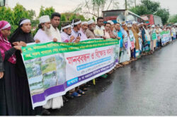 আজ শনিবার (১ নভেম্বর) সকালে ঢাকা ময়মনসিংহ মহাসড়কে কাফনের কাপড় পরে বিক্ষোভ মিছিল ও প্রায় ঘণ্টা খানেক সময় মানববন্ধন করে ভুক্তভোগী কৃষকরা।